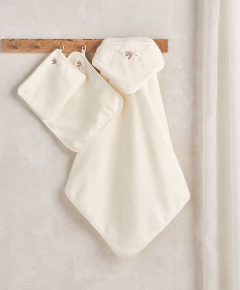 Ez a 3 részes törölköző szett tartalmaz egy arc-, egy kéz- és egy fürdőtörölközőt. Krémszínű, mokka és bézs hímzési részletekkel, szuperpuha pamutból készült.