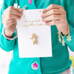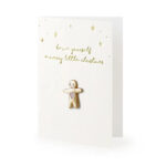 Fehér üdvözlőkártya arany színű nyomtatással és mézeskalács emberkével. A mézeskalács mérete 2.5 x 3.5 cm, a kártya mérete 10.5 x 14.8 cm. Szépséges kísérő elem egy kedves ajándék mellé.