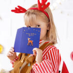 Sötétkék üdvözlőkártya arany színű nyomtatással és szarvas díszítéssel. A szarvas mérete 3 x 4.5 cm, a kártya mérete 10.5 x 14.8 cm. Szépséges kísérő elem egy kedves ajándék mellé.