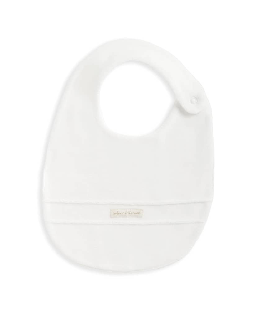 Puha bársony előke állítható patentos rögzítéssel, ‘Welcome to the World’ jelöléssel.
