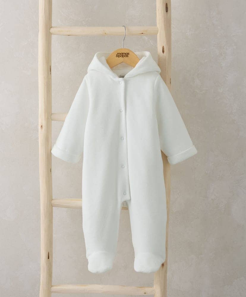 Fehér velúr kapucnis bundazsák nyuszifülekkel. Patentos rögzítés az egyszerű öltöztetésért. Pihe-puha velúrból készült a melegség és kényelem érdekében.