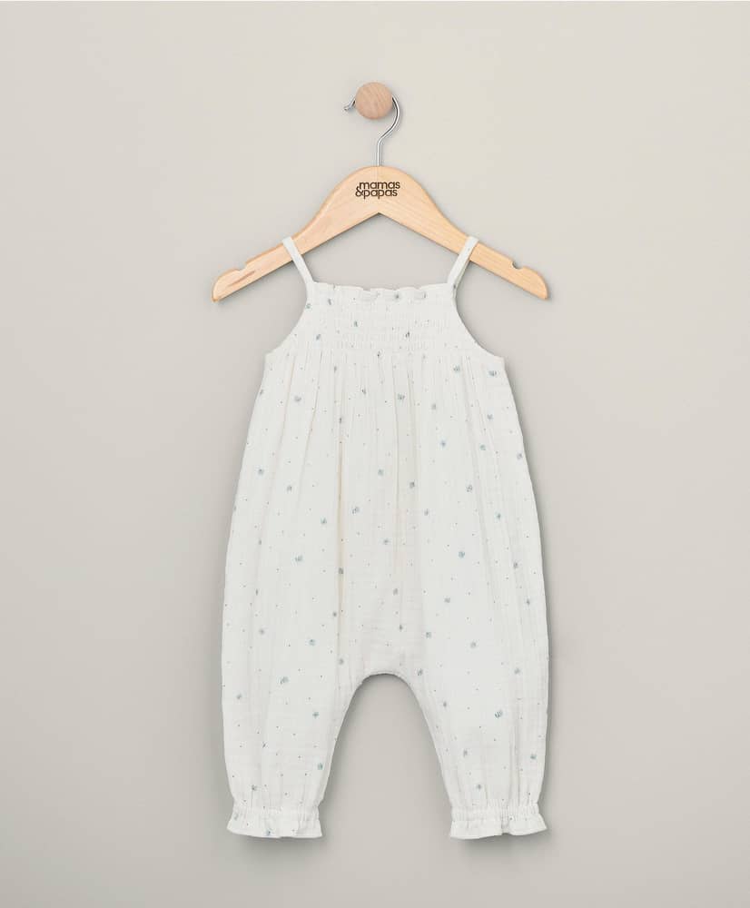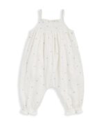 Pántos ujjú szövött overál, szétszórt virágmintával: Smokkolt nyakkivágással és masnival a pántokon. Rejtett patentos rögzítéssel a láb között. Rugalmas fodros lábszárral. 100% pamutból készült.