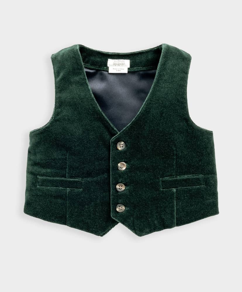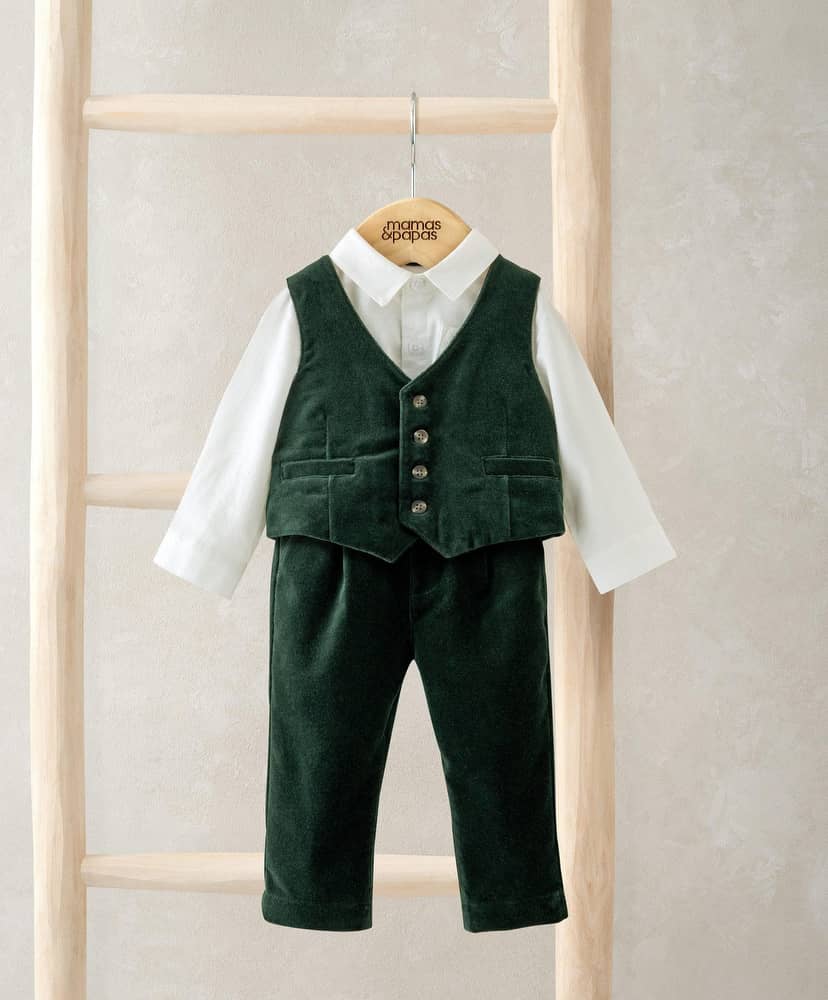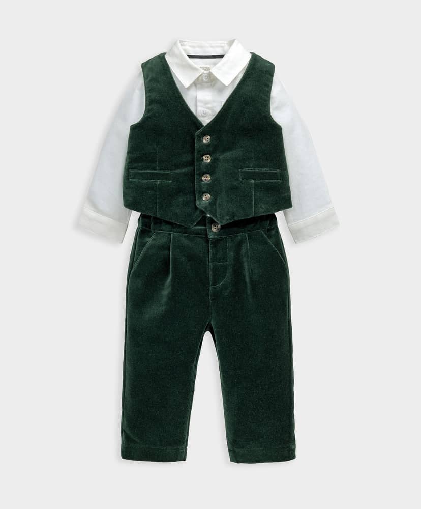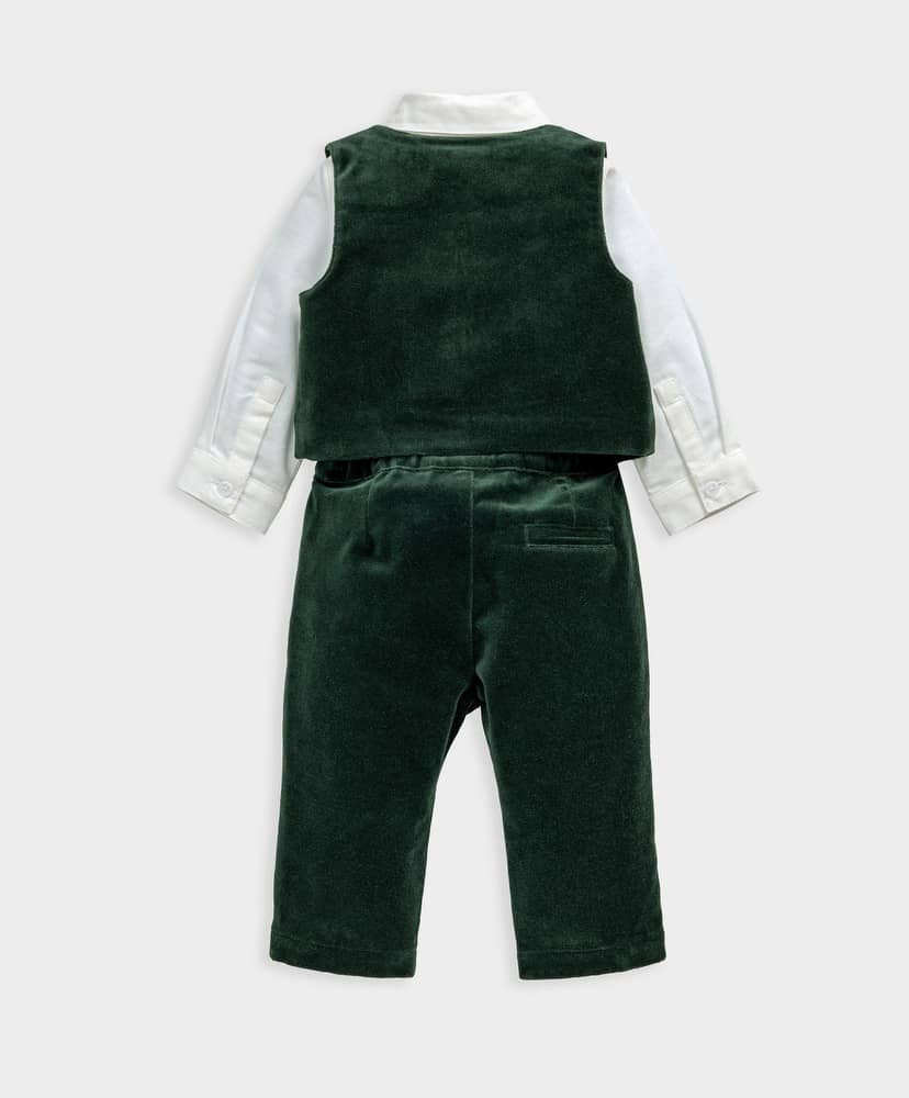 Stílusos és elegáns 3 részes öltöny, amely tökéletes választás különleges alkalmakra vagy ünnepi eseményekre. A puha velúr anyag és az összehangolt színvilág igazán kifinomult megjelenést kölcsönöz gyermekednek.