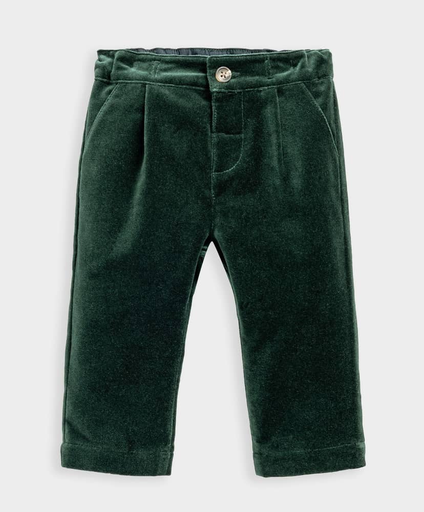 Hozzáillő zöld velúr nadrág gombos zárással és gumis hátsó derékrésszel